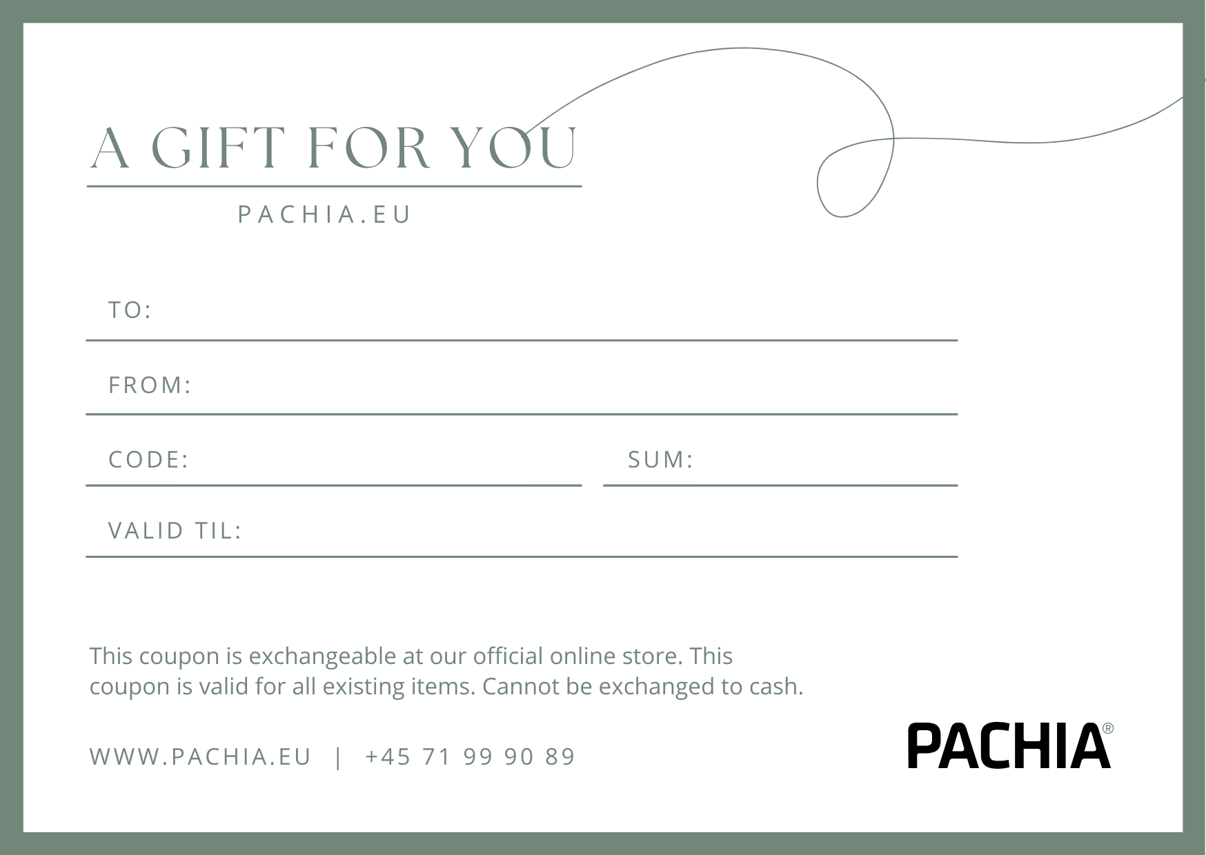 Køb et digitalt gavekort til pachia.eu. Du får straks gavekortet tilsendt på mail. Ingen ventetid – køb, print og giv gaven med det samme!