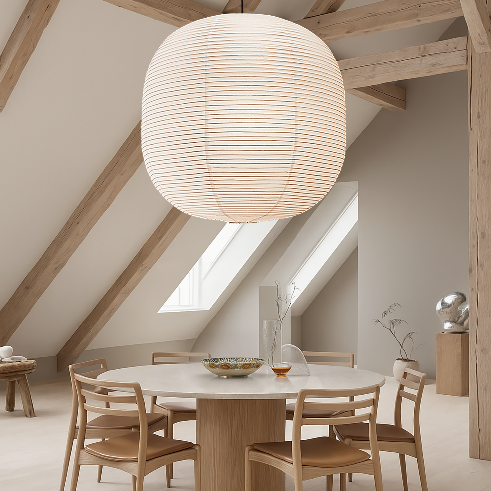 Lad denne majestætiske lampe skinne i rum med høje lofter, hvor den svæver som en elegant sky, og skaber et imponerende fokus. Tag din indretning til nye højder med vores Také-rispapirlampe.