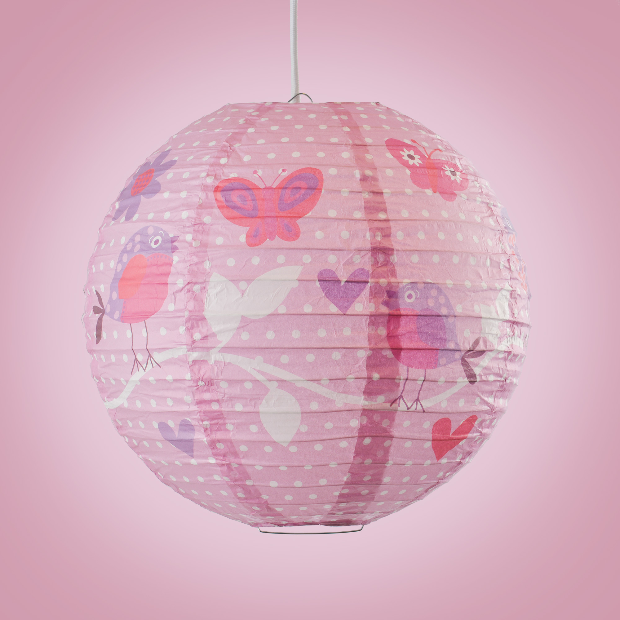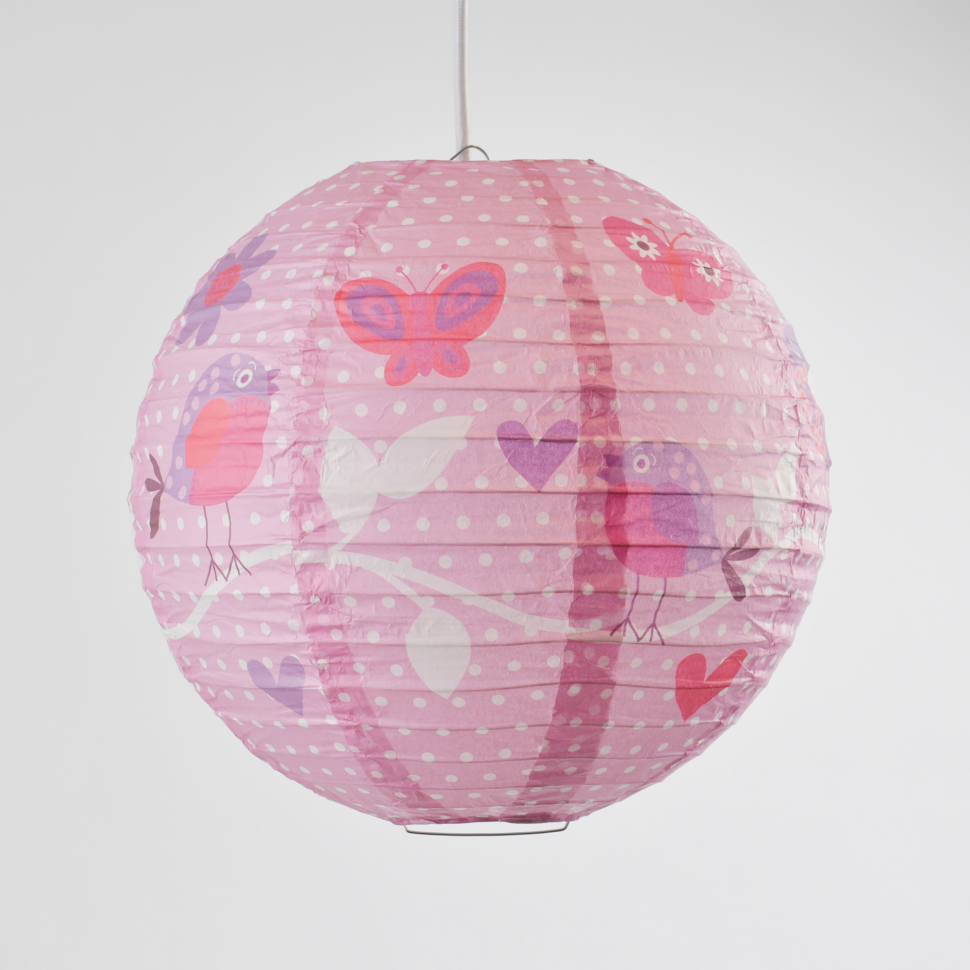 Charming lovebird rice paper lamp with cute little birds, butterflies and hearts. A wonderful lamp for the children’s room.