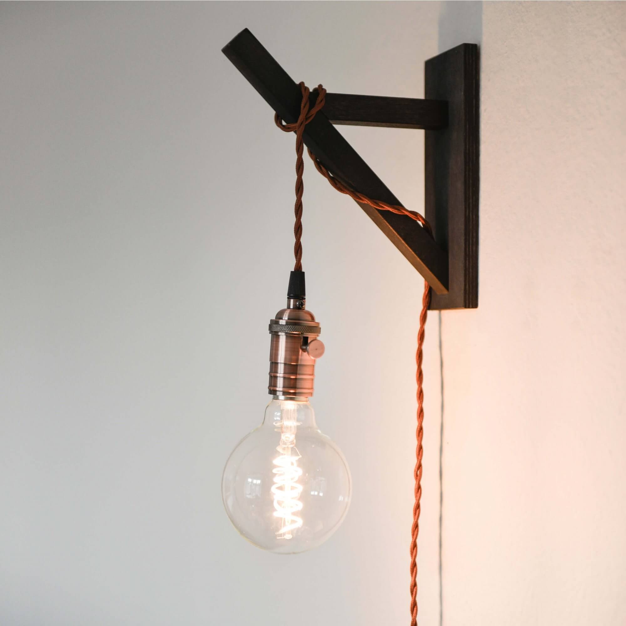 Retro lamp setting with a copper socket and matching brown fabric cord. The socket’s pivot has an on/off function, so you can control the bulb directly from the socket.